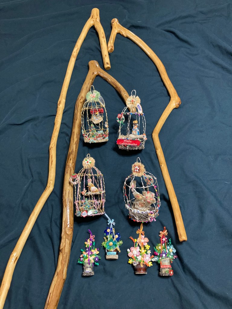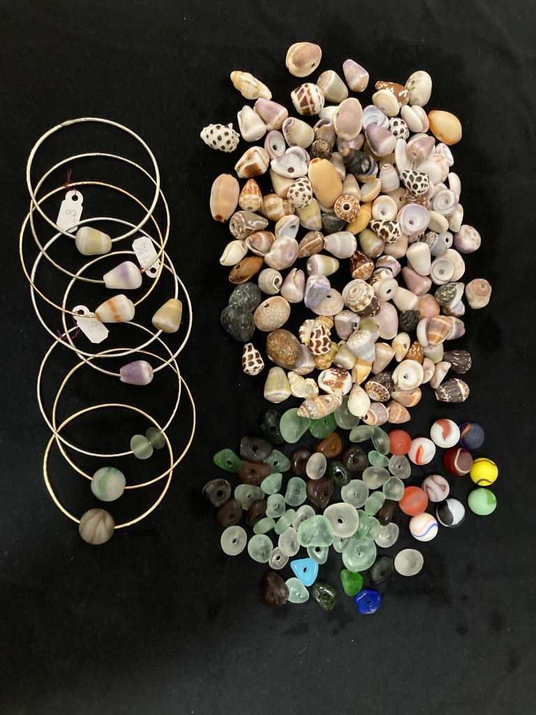 Everything is made with items found on our Kauai beaches. Sea glass, shells, pebbles, coral, ceramic, marbles, plastic, fishing nets, sand, everything and anything that wash up on shore.