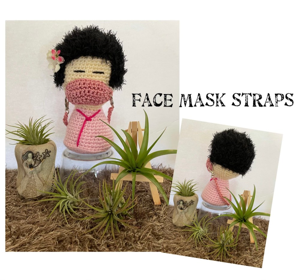 Crochet 808 Face Mask designs are to help us be safe and mindful. Face mask straps for adults and children. Straps are crocheted with durable, sturdy, colorful nylon thread. Adult sizes are $5.00 and Children are $4.00.