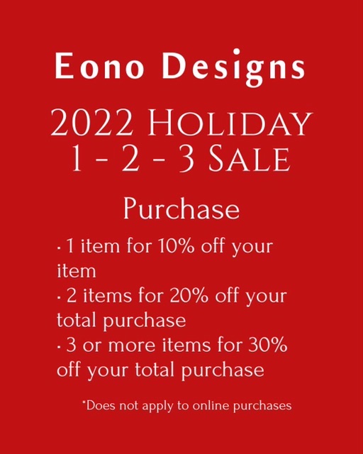 Eono Designs is happy to be participating in the 2022 Kauai Handwork’s Holiday Craft Fair with its 1-2-3 Sale.